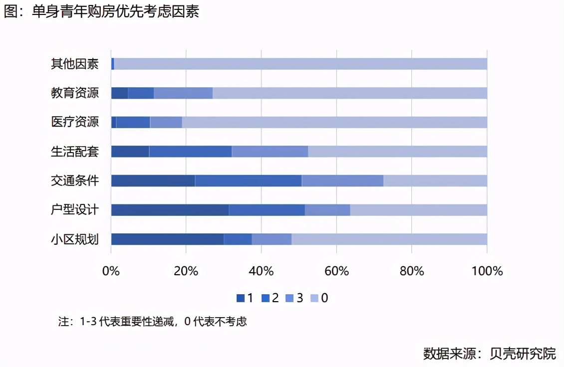 值得关注的是,单身青年偏爱新房、小户型。调研显示,仅14.68%的单身青年倾向二手房,占比明显低于恋爱或已婚状态的21.6%和20.19%。购房理想面积80平方米以下的单身青年占比28.96%,超过已婚青年群体占比。此外,单身青年较为看重房屋周边交通条件,户型设计、生活配套及小区规划,相对而言,教育、医疗资源对购房意愿影响较小。