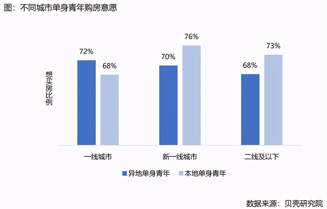 异地漂泊的大城市单身青年对“家”的慰藉更为渴求。根据调研,近六成一线城市单身青年和近半数新一线城市单身青年来自异乡,他们中想要买房的占比超过70%,高于二线及以下城市。而本地青年的购房意愿受到现实因素和实用价值等多方面影响,新一线城市的本地单身青年置业愿望较高,占比达到76%。