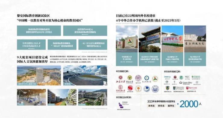 2023年4月23日陵水黎安国际教育创新试验区招商会上,海南省教育厅、清华大学以及南方电网有限责任公司签署战略合作,后期开展的部分项目也会落户在教育园区。同时,作为国内第一所外方独立办学的德国比勒费尔德应用科学大学将落户海南,并且前两年拟在陵水黎安国际教育创新试验区先行办学。