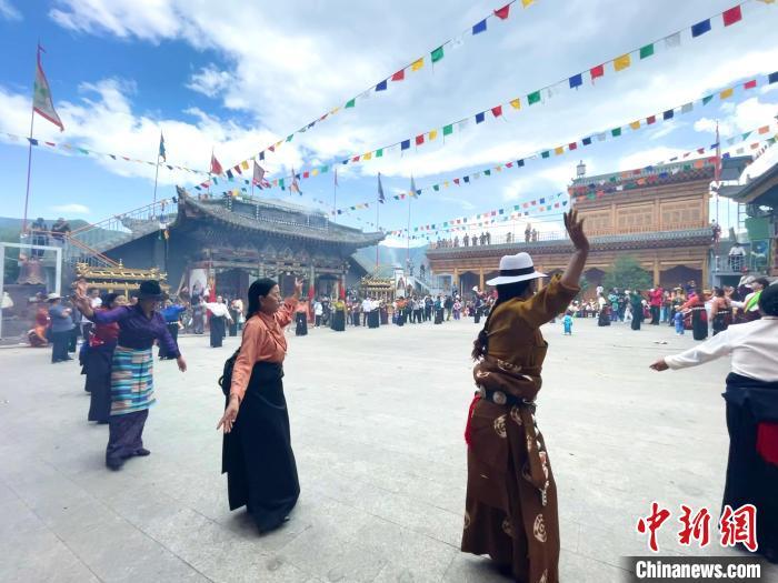 中新网青海黄南7月28日电(祁绣娟)27日,青海黄南藏族自治州同仁市四合吉村,首批高级“非遗”项目热贡“六月会”民俗活动举行,百余民众祈愿风调雨顺、五谷丰登。