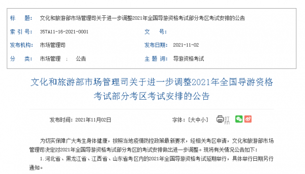11月2日,文化和旅游部发布《文化和旅游部市场管理司关于进一步调整2021年全国导游资格考试部分考区考试安排的公告》,公告全文如下: