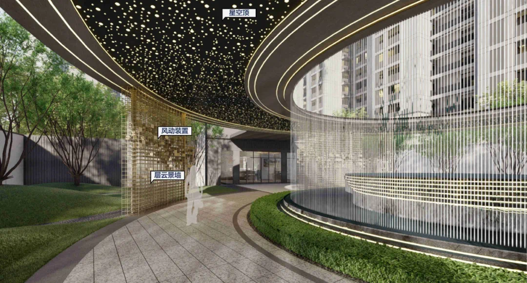 园林景观方面,遵循天人合一的理念,以“云动影驳、贵府星辰”为主题,实现景观与建筑融合,在入口、厅堂、亭台、水景、林荫等营造多维空间,满足云上顶端生活需求。