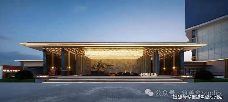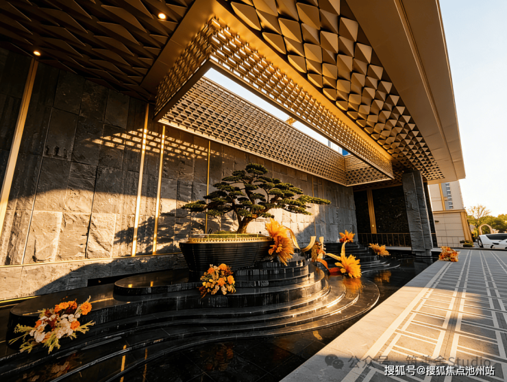小区大门横跨约42米,高约8米,黑色石材基座托举着跌水景台,一株姿态优美的迎客松巍然屹立。其后是深色石材与古铜色铝板线条交织的背景墙,顶部点缀着哑金色华盖与金色龙鳞纹铝板。造型以博士帽为核心意象,顶部哑金色华盖 + 金色龙鳞纹铝板,两侧深色奢石柱廊;进口弧形奢石基座、叠水景台、冠幅约 6.5 米迎客松、深色石材景墙 + 古铜色铝板线条。