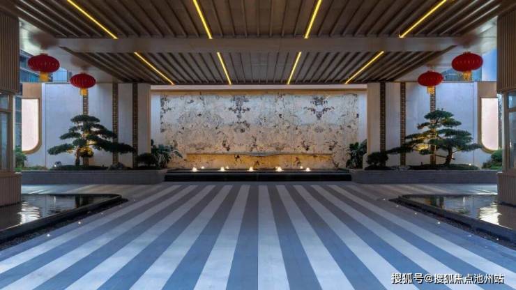 拾阶而上,登堂入室,大整面“潘多拉”奢石对景,形成“入园的照壁”,也区隔出“切换归家情绪”的二进空间;安哥拉黑石材打造镜面水系涌泉,两侧罗汉松列植,光影斑驳中的“松石意趣”,颇具东方意蕴的“大宅仪式感”。