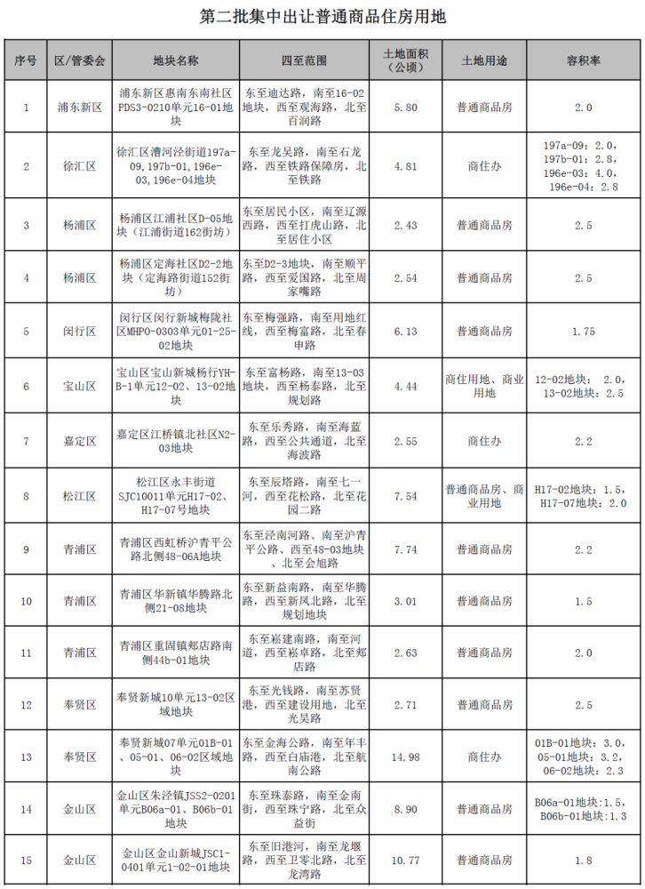 焦点财经讯 耿宸斐 7月30日,上海第二批住宅双集中供地信息出炉,23宗地块中有15宗为纯住宅用地,7宗为商住或商住办综合用地,1宗为租赁和商住混合用地,合计用地面积约149万㎡。据悉,第二批土拍拟于8月9日-8月13日进行集中出让。