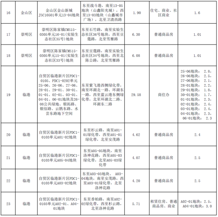 本次待出让地块中包括临港5幅;金山、青浦各3幅;杨浦、奉贤、崇明各2幅;徐汇、浦东、松江、嘉定、宝山、闵行各1幅。