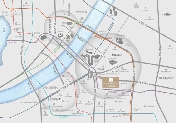 周边大小“莲花碗”、T - ONEMO(在建)、奥体中心、奥体印象城、滨江银泰城、杭州 SKP(在建)等地标建筑星罗棋布,构建起一个资源高度聚集的城市封面区域。同时,项目往西约200米便是重要交通干道风情大道,依托三横两纵的便捷路网,能够快速通达滨江区政府、万象城、来福士、市民中心等城市关键节点,交通优势显著。