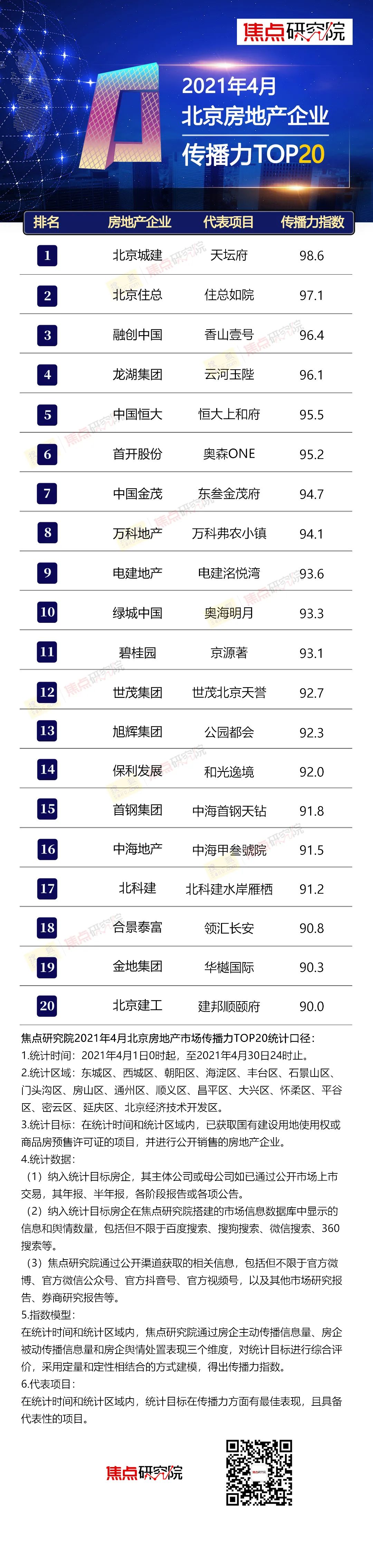 5月17日,焦点研究院发布《2021年4月北京房地产企业传播力TOP20》榜单,北京城建、北京住总和融创中国分别以传播力指数98.6、97.1、96.4位列榜单前三名。