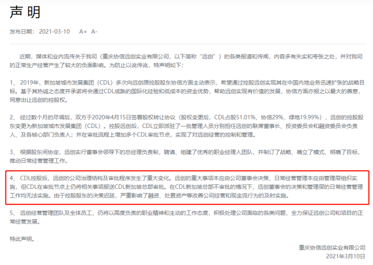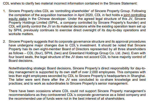但是CDL对此并不买账,针对协信远创的声进行反驳,表示其对CDL的指责均为不实,大致意思为协信远创董事会共有8人,协信和绿地各有2个名额,CDL所占据的4个董事会席位,不会对协信远创构成控制。