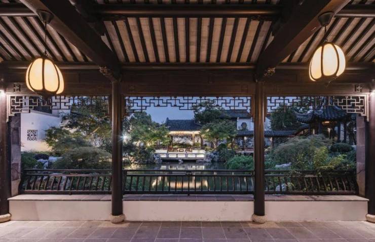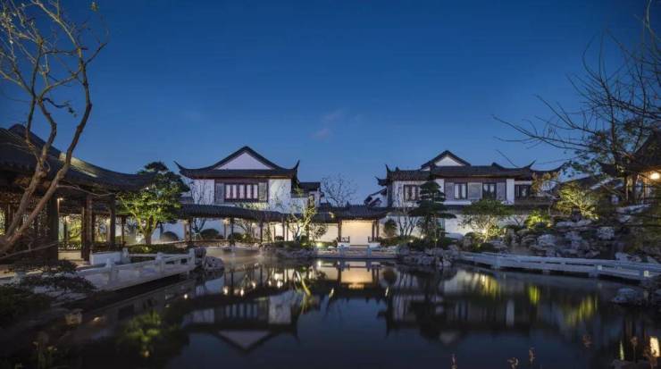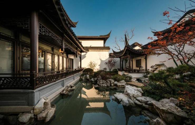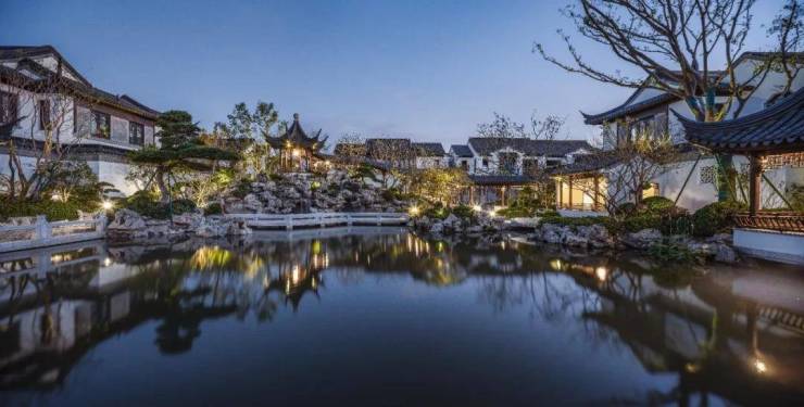 尤为值得一提的是,上海桃花源的中轴五进制园林,其完整性与丰富度,在全国中式园林中堪称翘楚。自正南入园,一路前行,对景峰石、曲折水街、太湖山石、精巧亭台与轩廊,逐一映入眼帘,仿佛步入一幅流动的山水画卷。宽广山石庭园与辽阔水景交相辉映,营造出一种潆回环抱、意趣无穷的意境,尽显江南温婉与隽永之美。