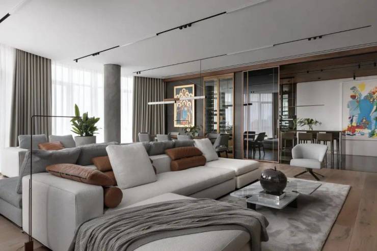 由设计师Artur Sharf,Artem Zverev,Alesia Riamova,Anya Tarabanova,Gleb Brizhanov共同设计,客厅以灰白色为主,与金属材质搭配,加入工业风元素,使得格调满满的,纯粹而惊艳。