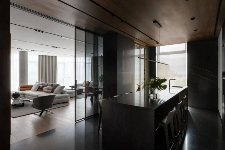 大大的空间,视觉感强烈,移动的玻璃门把客厅和厨房餐厅隔开,中央岛台和餐厅一体,线条简单,原木色天花和光线烘托出强烈的戏剧感。