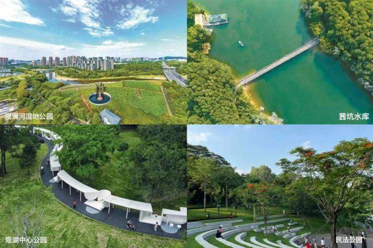 生态公园:观澜河湿地公园、茜坑水库、观湖中心公园、民法公园、九龙山公园等;