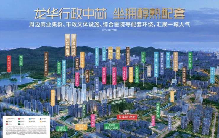 项目与龙华区政府一路之隔,区政府、公检法大楼等市政机构入驻,承接区域规划发展;
