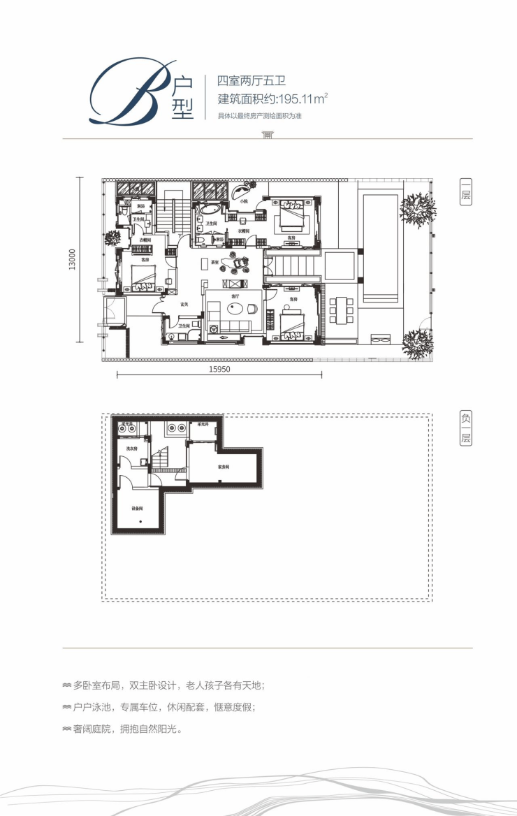 B户型:四室两厅五卫 / 建面约195 ㎡