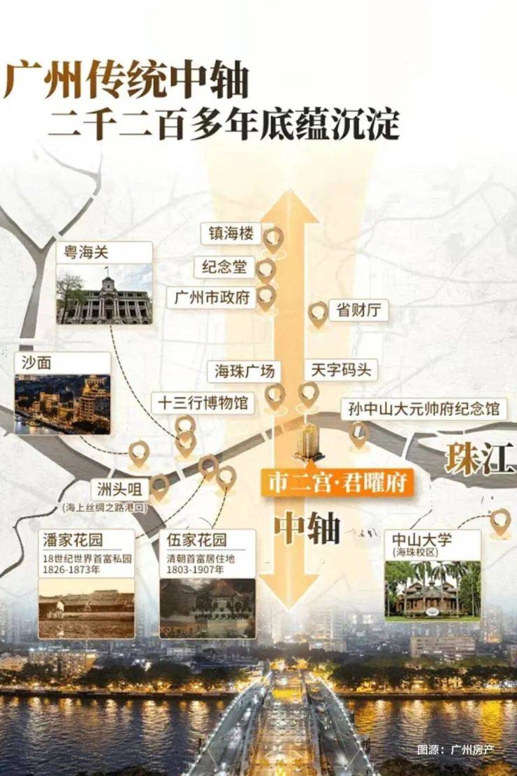 君曜府所在的市二宫板块,是很多老广心中的“白月光”。作为广州千年中轴与珠江前航道的交汇点、海珠区最早成熟的板块之一,这里曾是十三行时期的贸易核心与豪宅发源地,承载着广府文化底蕴与城市发展脉络。