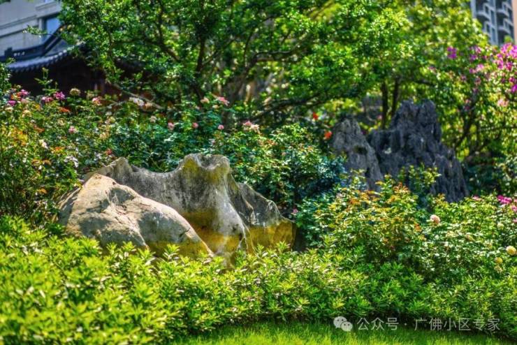 数十块造型奇特的景石营造延绵山脉的效果,配合全冠移植的超大乔木,姿态各异的花卉与植被,浓缩成“千里江山尽在此园”的意境