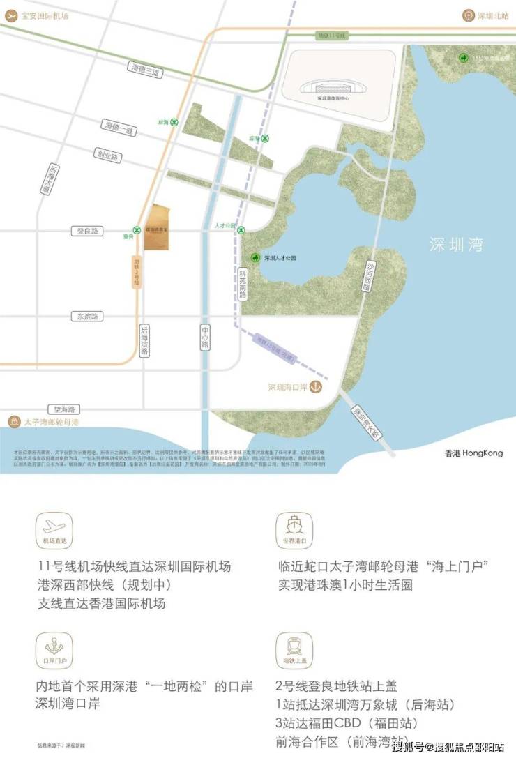 公共交通:与地铁2号线登良站无缝衔接,步行可达地铁11号线后海站,通过换乘可快速通达福田CBD、深圳北站、宝安国际机场等核心区域;周边多条公交线路环绕,日常出行便捷。自驾出行:临近广深沿江高速、南坪快速、沙河西路等城市主干道,10分钟可达南山中心商圈,15分钟可达福田CBD,20分钟可达宝安国际机场;紧邻深圳湾口岸,20分钟直达香港,跨境出行高效便捷,轻松实现粤港澳大湾区一小时生活圈。