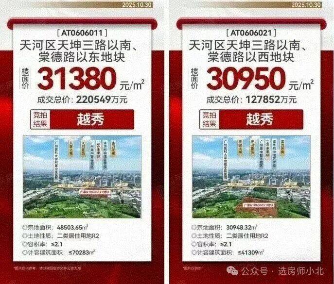 天河广棠片区AT0606021和AT0606011地块,被越秀地产以总价348401万元拿下。其中,AT0606021地块折合楼面价约30950元/平;AT0606011地块折合楼面价31380元/平