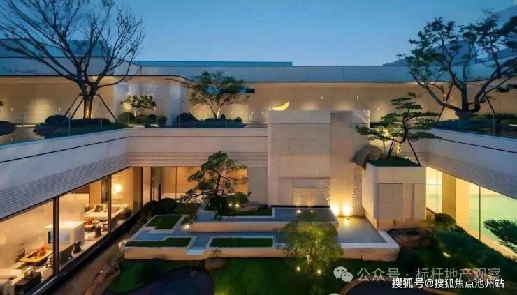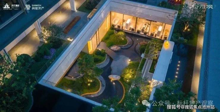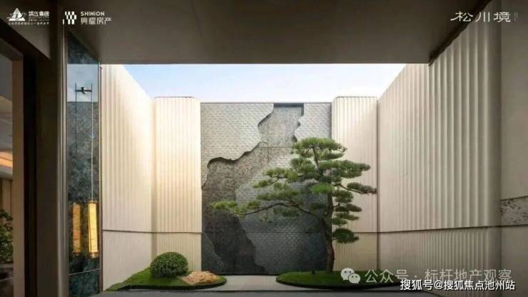 约3300平方米的中央景观,下沉式庭院与双水院景观错落有致,将《松阁观潮图》、《溪山行旅图》、《山亭文会图》三幅宋代古画,巧妙融入松川境的立体山水之中。高层与排屋区之间,一条长约210米的中轴景观横贯东西,串联起「松川十一境」的雅致画卷。该项目景观设计由北京顺景园林执笔。