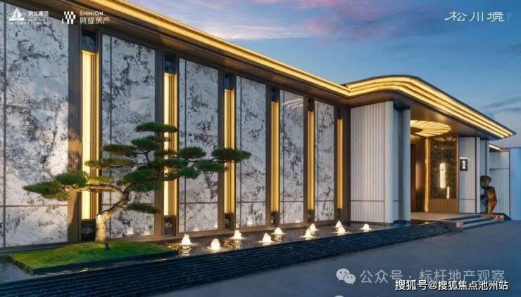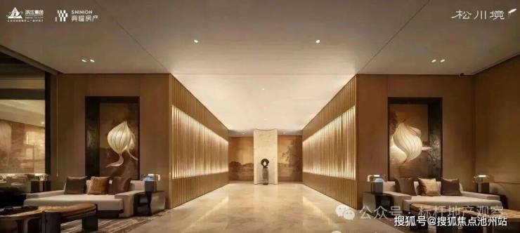 大门徐徐开启,步入序厅,眼前豁然展现《松阁观潮图》所蕴含的“动静相依”东方美学意境。定制套石的龙粼照壁在波光粼粼中熠熠生辉,构筑起松川境独有的文化印记与精神象征。松之静谧与潮之壮阔在此完美融合,每一步都隔绝了门外的喧嚣,实现了从纷繁世界到宁静家园的优雅过渡。