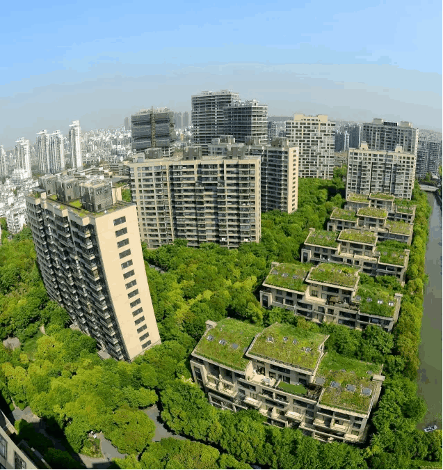 整个社区都是绿色森林,树海环抱,连底层都挑空6~9米,种植绿色,让每户人家都能“开窗见树”,让房子生长在森林之上。