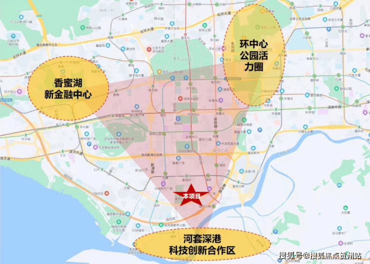 福田汇聚了行政、文化、金融、交通、会展、购物、酒店、公园与住宅九大核心配套设施,呈现出多元化的城市生活体验。项目地处河套深港科技创新合作区、香蜜湖新金融中心和环中心公园活力圈这“三大新引擎”的交汇点,位于其三角地带的中心位置,尽享丰富的规划与资源优势,未来发展潜力巨大。
