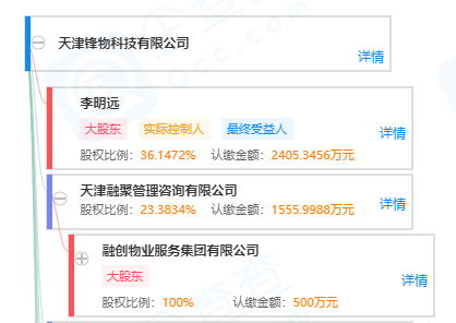 企查查显示,锋物科技所属公司为天津锋物科技有限公司,成立于2019年,注册资本6654.3万元人民币。目前,锋物科技排名前列大股东是其创始人兼CEO李明远,持有36.15股权;第二大股东是融创服务全资子公司天津融聚管理咨询有限公司,持股23.38%股权。