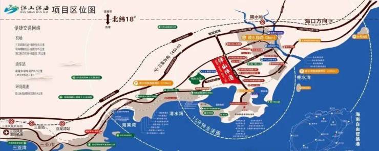 项目距三亚市区约45公里;距三亚凤凰机场车程约77公里;距陵水动车站6.3公里;距国黎安港7公里;距富力海洋欢乐世界5公里。距新村码头10公里。目前海南环岛动车已全线贯通,湾区内部市政公共交通、穿梭巴士等均已投入运营,多维高效交通网络,让您畅游岛内外。
