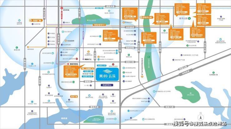 三、【区位介绍】美的·云筑处于康魅路与流芳路交汇处,北至康力街,东邻光谷二路,比邻金融港、产业园等【金融港】【产业园】