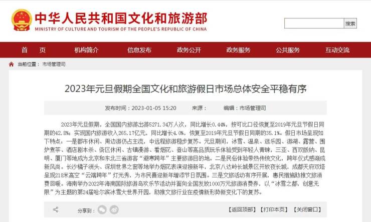 据介绍,2023年元旦假期,全国国内旅游出游5271.34万人次,同比增长0.44%,按可比口径恢复至2019年元旦节假日同期的42.8%;实现国内旅游收入265.17亿元,同比增长4.0%,恢复至2019年元旦节假日同期的35.1%。