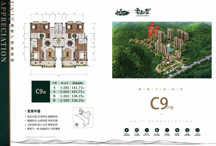 大城云山整个社区呈葫芦状,三面环山聚宝盆格局,置身于超4000亩北回归线森林公园里,植物资源极为丰富,公园内所有测点负离子浓度都在1500个/㎡以上,公园内空气清洁度达到最清洁的A级,典型的低密度住宅,整个建筑依山而建,顺山而居,形成融于自然山水的生活社区——真正公园里的家