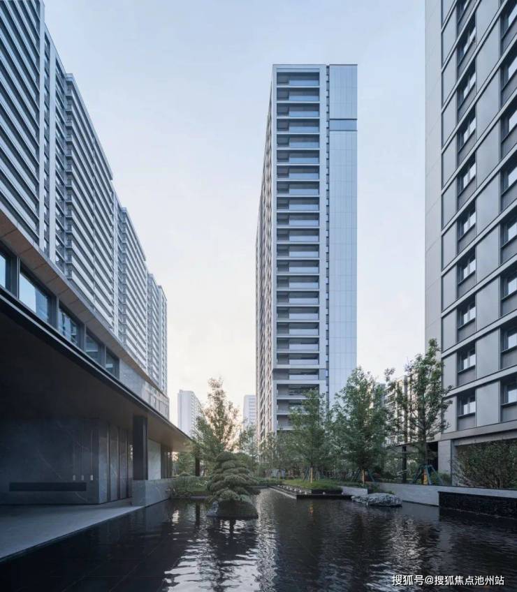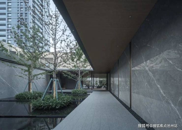 门头右侧结合大面积玻璃及竖向的铝板造型,勾勒出虚实结合的建筑形象,拉伸门头的视觉观感,透露出“奢而有度,简而不凡”的设计风格。这样的设计不仅强化了入口处的视觉冲击力,也使归家的第一印象更加深刻,彰显了社区的独特品味与尊贵气质。步入其内来到精心水院,镜面水景将空间映衬延展,水天相接,天光一色。