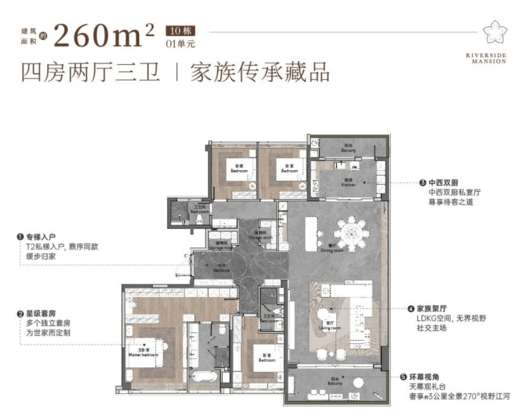 建面约260㎡户型则更进一步,堪称南向一线望江的“标杆之作”。