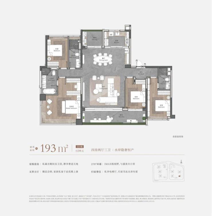 建面约193㎡户型采用了“专梯专户”的配置,增强了私密性与安全感。