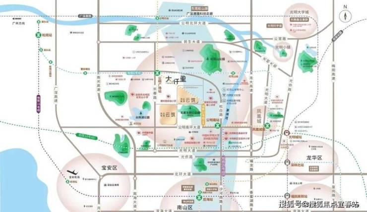 光明南接深圳南山科技园,北联东莞松山湖,向上链接东莞水乡新城和广州大学城,是粤港澳大湾区的重要战略节点,占据中国科创发展大动脉;汇聚中山大学深圳校区、国家超算中心等世界一流科创资源,打造世界一流科学城。