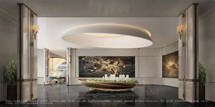 上方悬垂的艺术吊灯 并非一味追求宏大,而是更注重造型的现代感与光影的层次,光线柔和地洒下来,营造出静谧、高级的氛围。