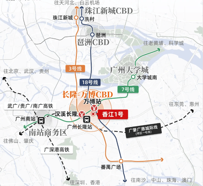 香江1号交通便捷,社区临近地铁18号线南村万博站,可快速接驳珠江新城及天河核心区域。周边道路体系完善,包括快速路、高速路及城市主干道,多条公交线路覆盖,形成多维立体出行网络。