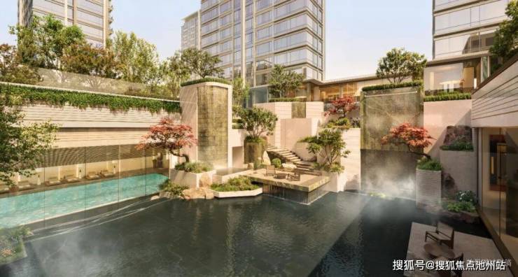 沐芳洲将大水院前置,做出了一个奢侈的超级前场。在长约150米的恢弘界面上,顽石、叠水、绿植、艺术雕塑高低错落分布,还有一面叠瀑从建筑立面里垂延出来。