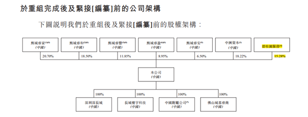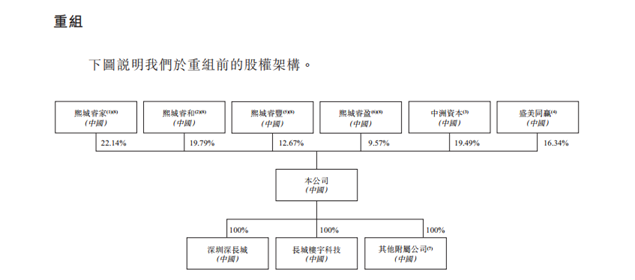 在重组前,长城物业由熙城睿家、熙城睿和、熙城睿丰、熙城睿盈、中洲资本以及盛美同盈共同持有,持股比例分别为22.14%、19.79%、12.67%、9.57、19.49%及16.34%。