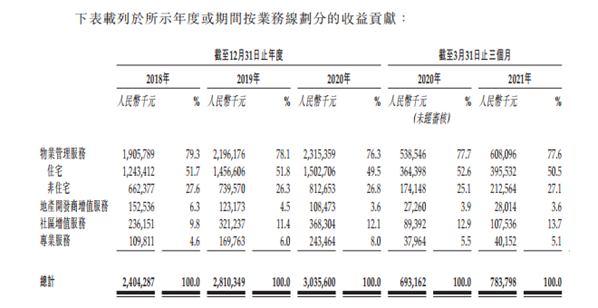 长城物业的收入主要有物业管理服务、地产开发商增值服务、社区增值服务和专业服务。2020年,其物业管理服务收入约23.15亿元,占整体收入76.3%,;地产开发商服务方面收入1.08亿元,收入占比3.6%;社区增值服务方面录得收入3.68亿元,收入占比12.1%;专业服务方面收入2.43亿元,收入占比8%。