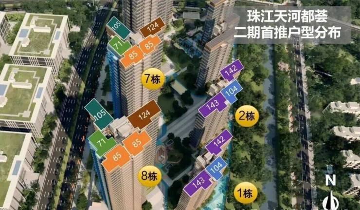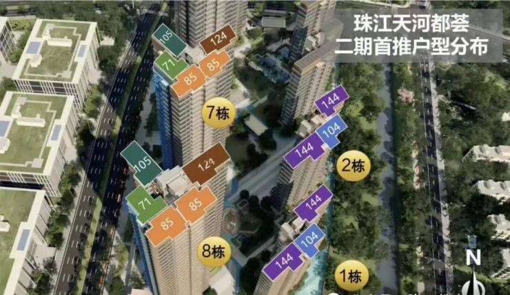 珠江天河都荟,总占地面积5.5万㎡,总计容建面11.56万㎡,分南北两地块开发,首推北地块,容积率2.0,共4栋,货量284套。首推建面约72-152㎡,户户朝南,超宽楼间距。