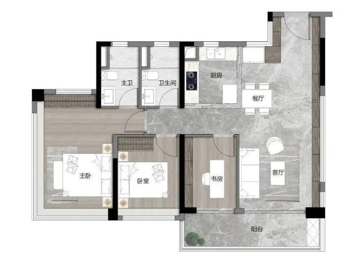72㎡就做到三房两卫,四开间全南向,玄关位置可打造收纳柜,主卧是套房设计,带L型超大飘窗。