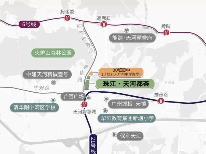 项目周边约300米处有广百广场、万科云城、时代E-PARK商业街等,下楼即可享受繁华生活。教育上,地块北侧公立学校(规划中)、配建6班幼儿园,周边还有广州华阳教育集团新塘小学、公立12年制清华附中湾区学校二期(在建)。