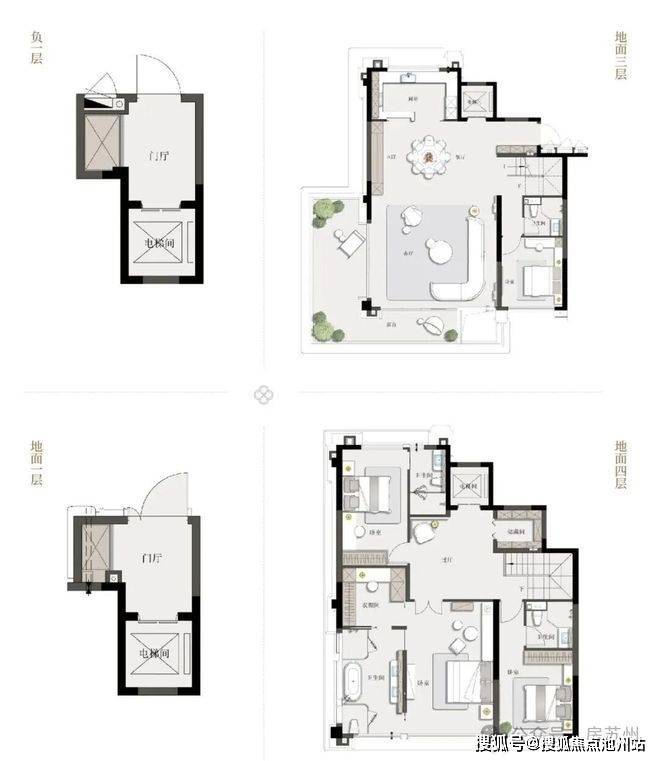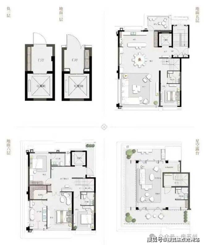 入户方式上,上中下叠都是独立花园+独家入户电梯,动线分割,私密性拉满。