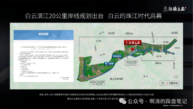 2023年广州发展聚焦白云,广州市规划院编制的《白云区珠江沿岸高质量发展实施规划》指出:白云滨江岸线将高标准打造20公里的高量发展示范带。20公里江岸将兴建13大滨江公园,其中槎头滨江公园就在项目楼下。