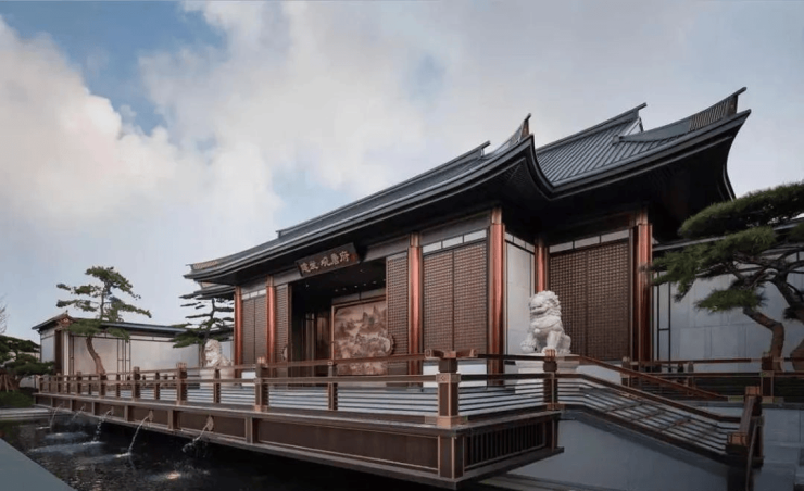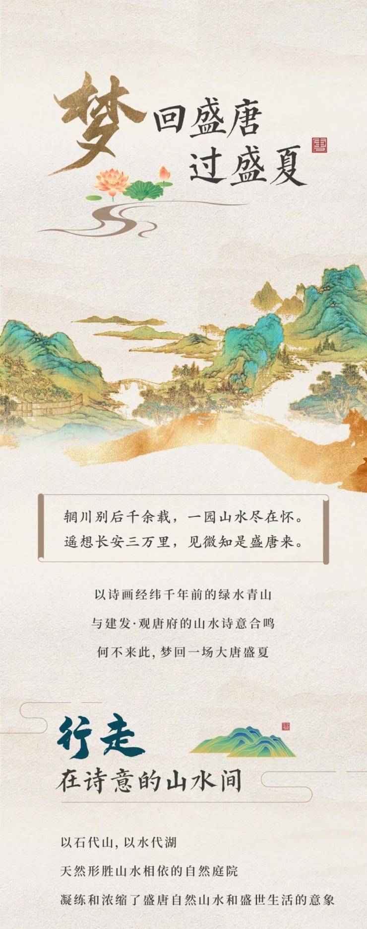 项目采用三段式入户:一进辋川入画(主入口空间),二进:闲庭碎影(戏台庭院),三进:临风听湖(自然庭院)。入户大门屋顶采用唐代“重檐歇山顶”形式配上台基上的唐代建筑标志阑干,入院后有一副唐风画作,其次以亭台楼榭、理水叠山的中国园林意境,重现盛唐大明宫百花争艳,小桥流水,落叶如金的景观。社区景观层层递进,让住户置身其中,体验唐风山水。