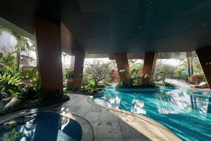 景观上十字行道路分布设置园林景观结点,以“奢级雨林密谷”的理念打造,形成椰林下的社交集会场地。由叠瀑入口空间、户外烧烤区、阳光草坪活动区三大区域组成,把功能、场景深度结合,满足各个年龄段的度假需求以及圈层交友。