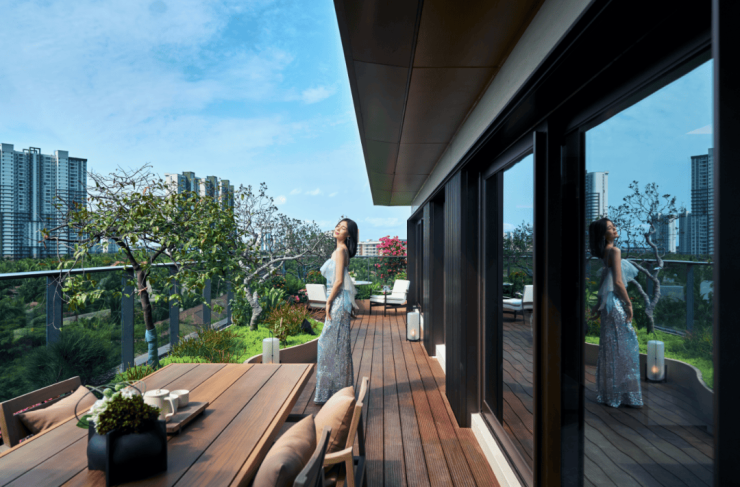 层层退台设计,实现了更多对花园和露台的需求,同时兼顾了更好的隐私性与通风性。这样的建筑设计在气候湿度较大的海南有着更强的舒适性。