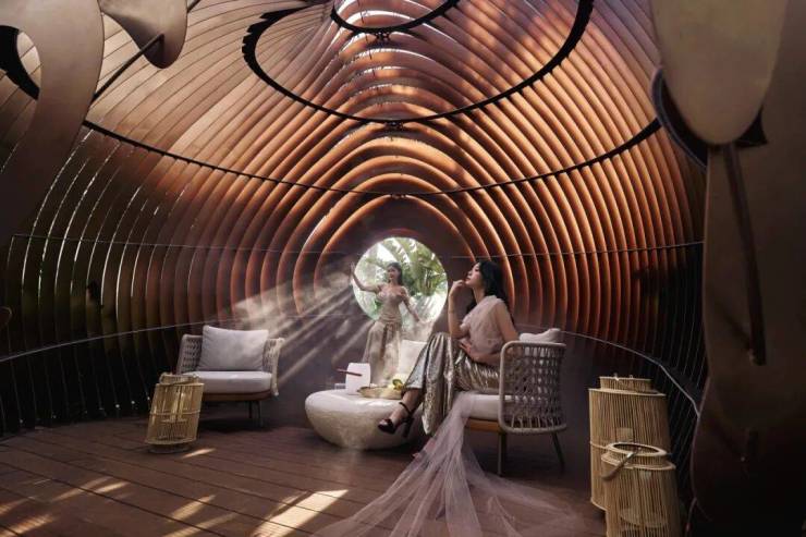 2300㎡私属会所——臻海CLUB,外场主要由蓝晶泳池、海螺休憩亭、听瀑煮茶三大区域组成,设计在考虑的时候是从客户的居住舒适性上出发,融入自然的多元社群活动场景。